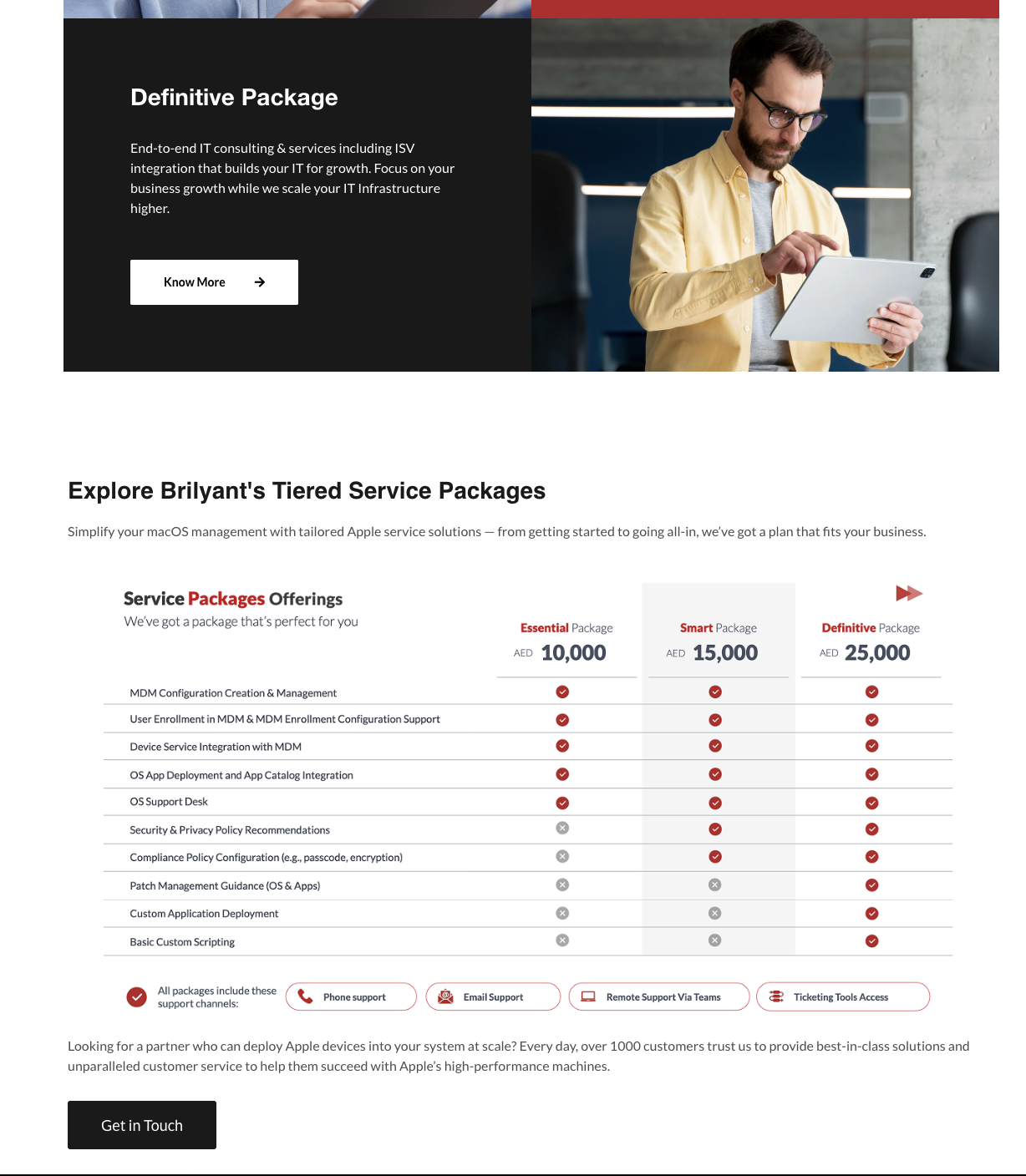 Project Summary: The UAE market is a new growth market for Apple in the enterprise. Discussions with Apple solution engineers and Brilyant’s presales and technical teams showed that there were significant barriers within enterprises to adopting Apple devices within their workplaces. I conceptualized and created deployment and management service packages with the Apple tech team and our internal preales team.